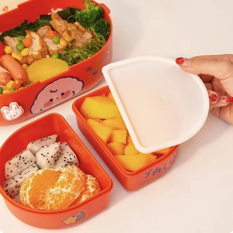 มี 3 ช่อง พร้อมช่องเก็บช้อนส้อมแยก มีสติ๊กเกอร์ 3D+2D ให้ติดตกแต่งได้เอง ชุดช้อนส้อม เข้าไมโครเวฟได้ ขนาด:22x15x12 cm